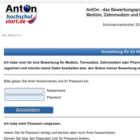 Der erste Antrag sollte ja nicht zählen, da ich noch nichts an hochschulstart geschickt habe. Ich habe einen Nutzerkonto bei hochschulstart angelegt. Doch wie registriere ich mich für AntOn ? Ich finde keinen Link dazu… kann mir jemand bitte helfen?